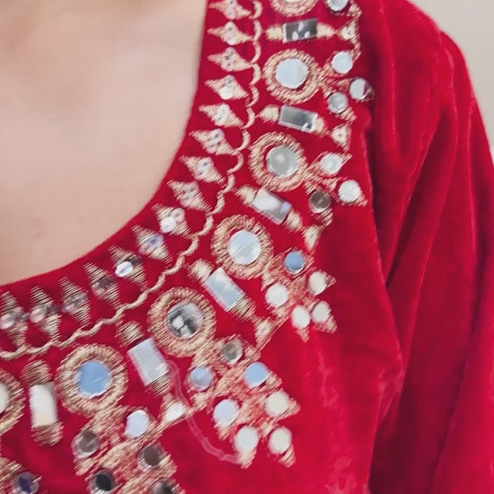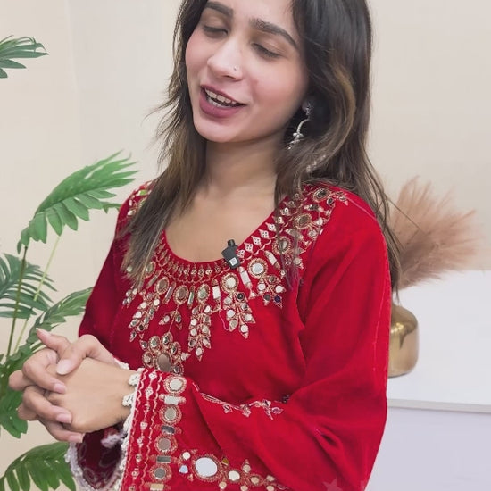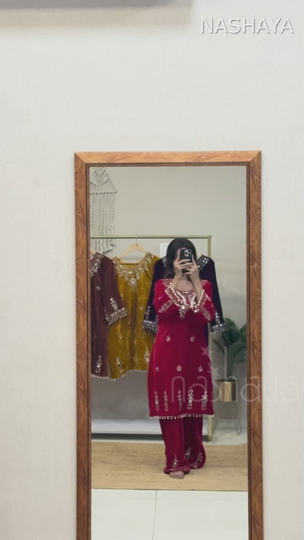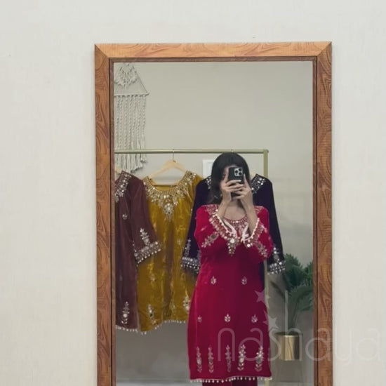 Velvet Real Mirror Work Suit Set - MUSTARD YELLOW