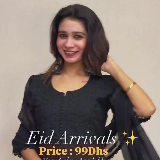 The lightweight texture offers comfortable wear, making it suitable for UAE weather while maintaining a polished festive appeal. This ready-to-wear three piece set is ideal for gatherings, office ethnic days, celebrations, and family functions.
