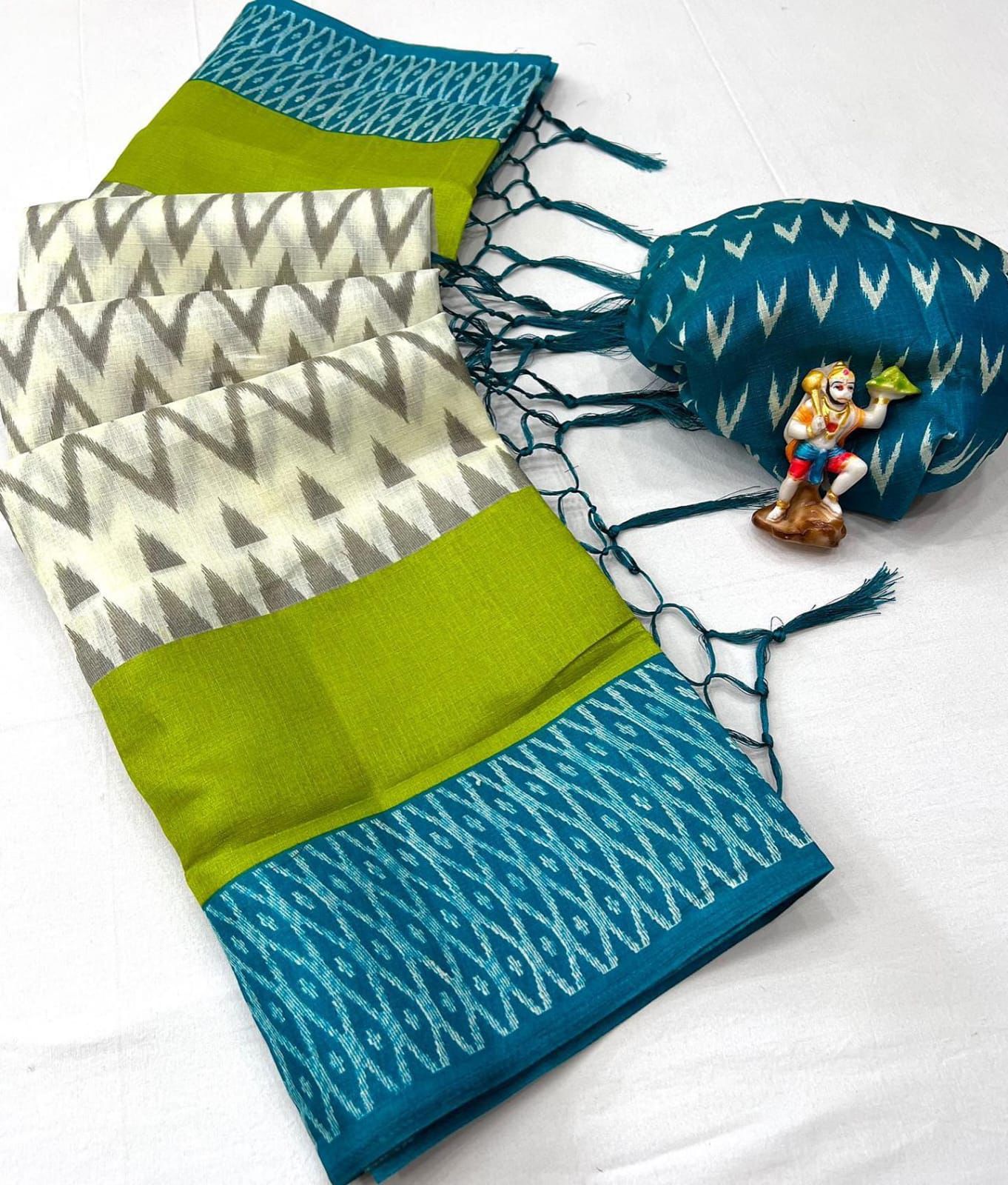 Experience everyday grace with this lightweight Khadi Silk Saree, designed with a rich HD Ikkat-style digital print and finished with charming tassels on the pallu. Paired with a matching running contrast blouse, it’s an ideal choice for office wear, casual outings, or thoughtful gifting across the UAE.