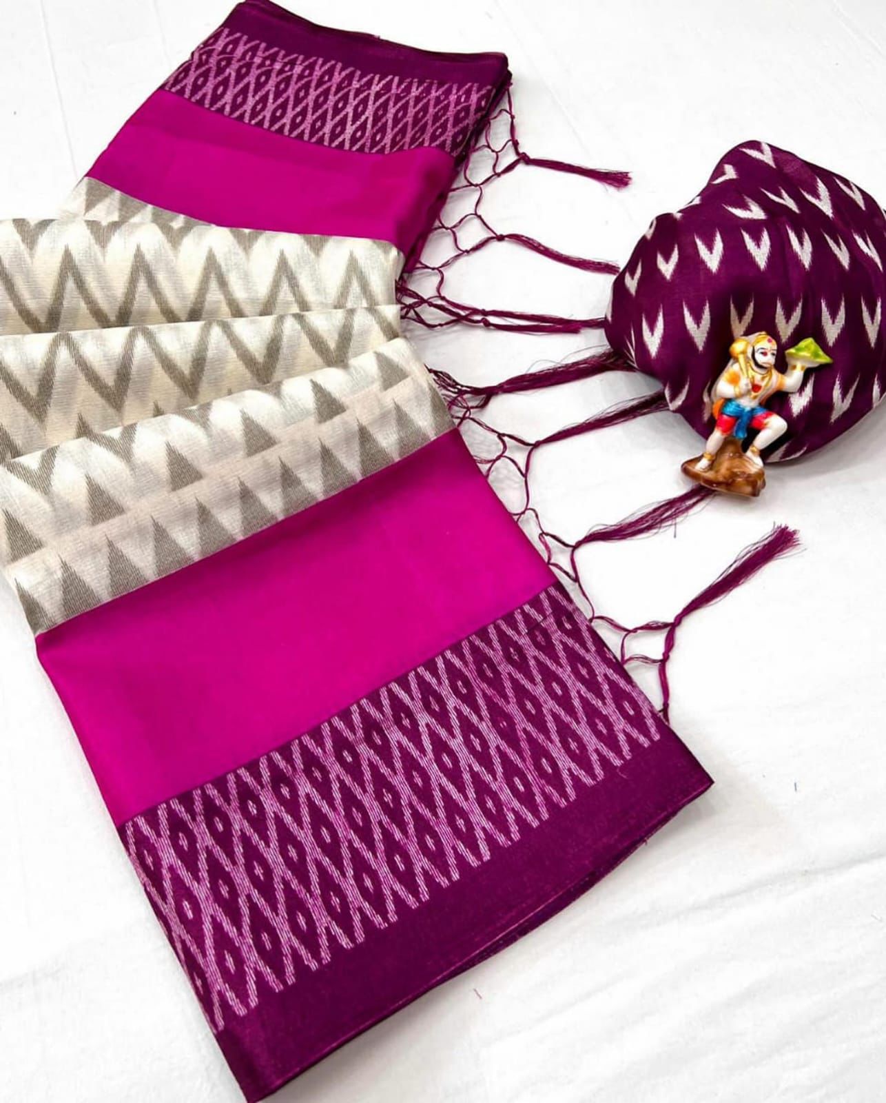 Experience everyday grace with this lightweight Khadi Silk Saree, designed with a rich HD Ikkat-style digital print and finished with charming tassels on the pallu. Paired with a matching running contrast blouse, it’s an ideal choice for office wear, casual outings, or thoughtful gifting across the UAE.