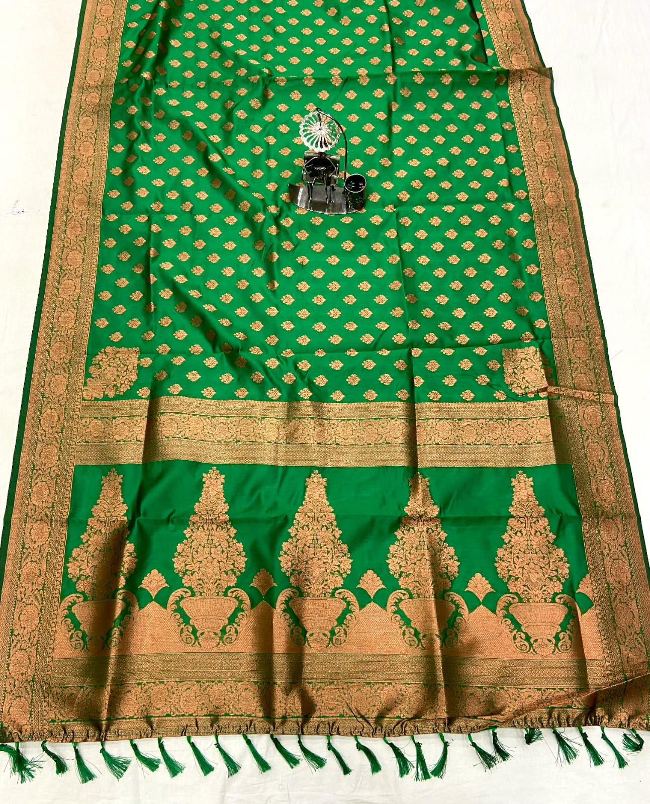 MAGNITE Soft Banarasi Silk Saree with Copper Zari Weaving & Rich Pallu GREEN