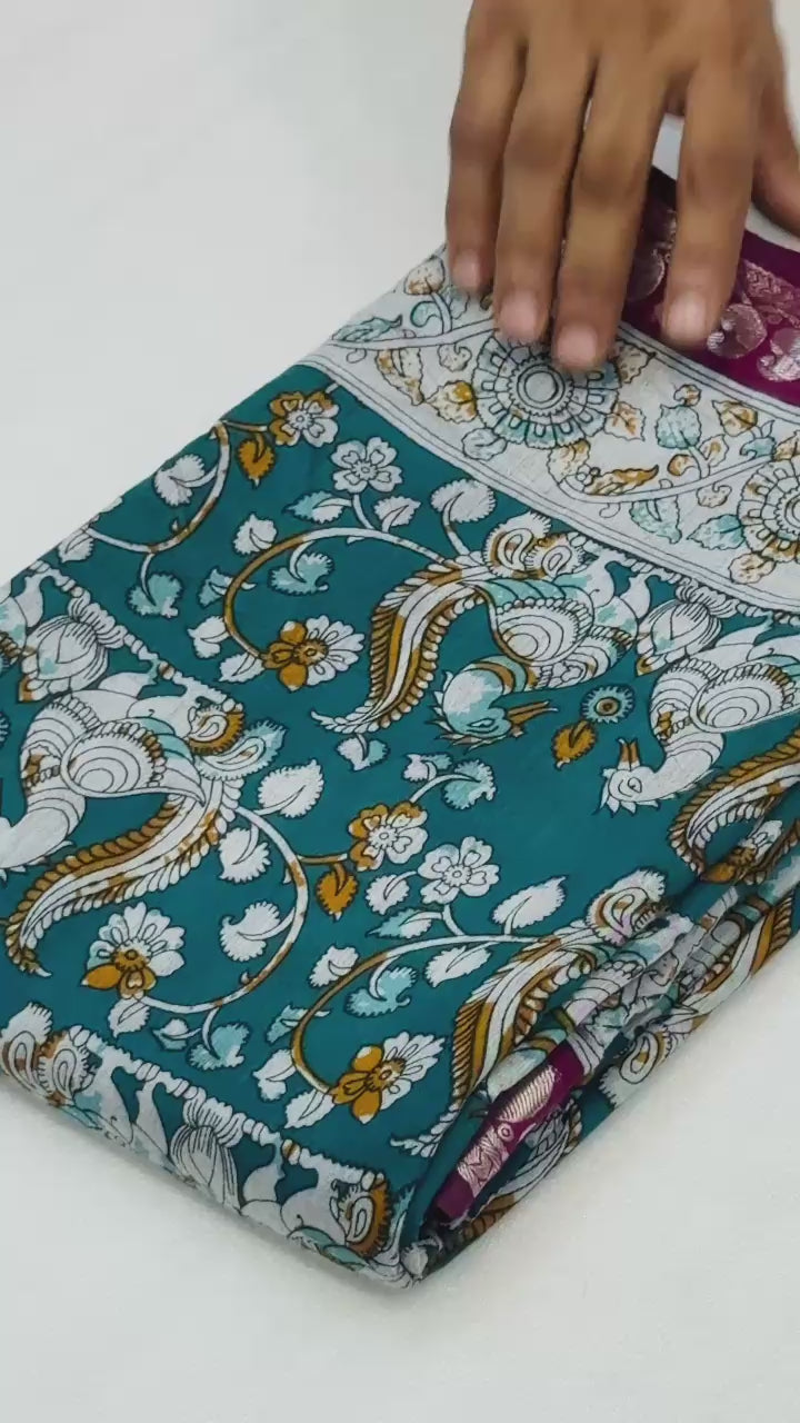 Graceful Kalamkari Print Mangalagiri Saree with Viscose Border – An Artistic Statement